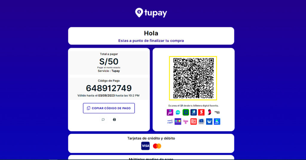 Tupay es el pago digital más completo. Cuando ingresas a pagar por Tupay dentro de los comercios y plataformas integradas. Te genera un QR y te muestra la infinidad de opciones para realizar tu pago ¡como tu quieras!
